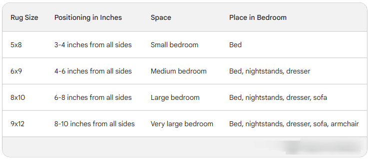 • Position the area rug so that it covers only the lower part of the bed and extends beyond it on one side (the headboard side and two sides can be left uncovered).